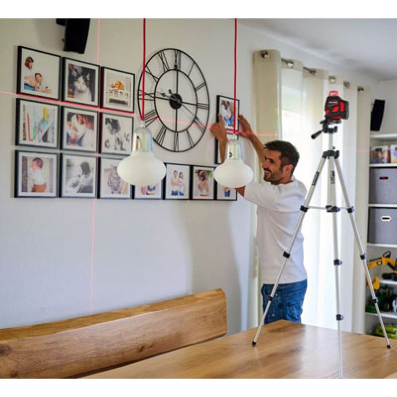 O nível de laser cruzado Einhell TC-LL 2 facilita o projeto de linhas laser laser cruzadas e únicas em paredes, pisos, tetos ou peças de trabalho. Usando o nível do laser cruzado, você pode alinhar telhas, bordas, papel de parede e objetos com precisão meticulosa. A colocação angular nas superfícies é possível graças ao grampo universal, permitindo que você posicione as unhas ou os marcadores de perfuração com precisão. Outra função do nível do laser cruzado é a de um nível de espirito digital, tornando as ferramentas de medição convencionais redundantes. Este nível de laser cruzado também possui uma função autonivelante, com um LED que avisa o usuário de ângulos de inclinação superiores a 4 ° graus. Uma rosca de 1/4 "está integrada para uso em um tripé. A manipulação confortável do laser de linha cruzada é assegurada pelo aperto suave.
