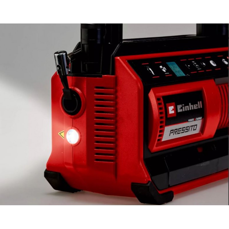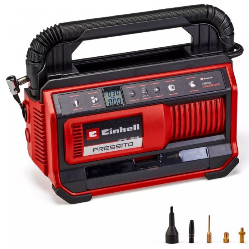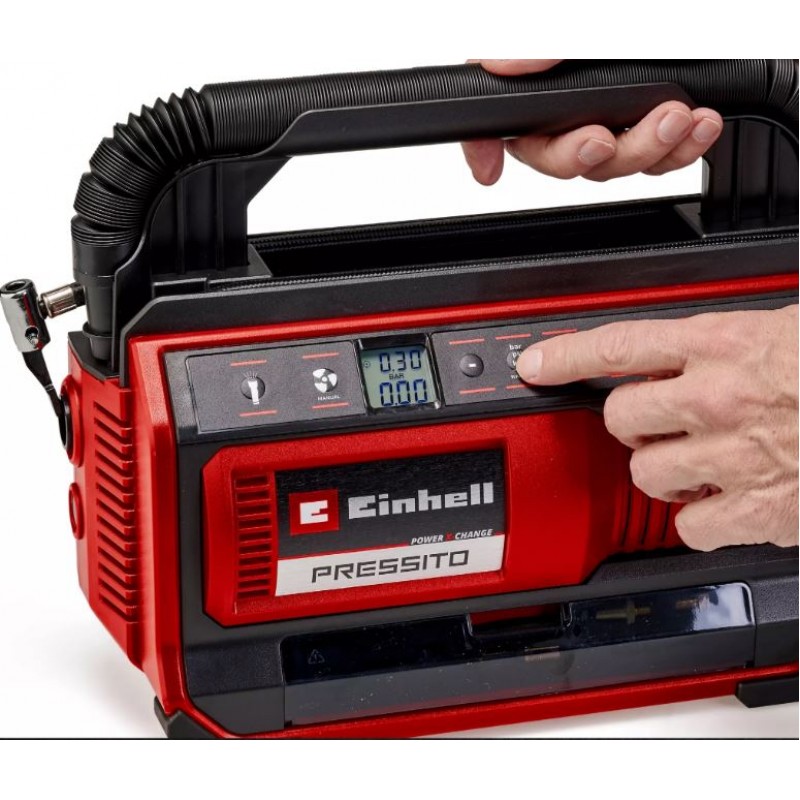 Com o compressor híbrido Einhell PRESSITO 18/25 Hybrid você nunca ficará sem ar: como parte da poderosa família Power X-Change, o compressor pode ser operado em casa com um cabo de alimentação ou em trânsito com uma bateria Power X-Change de 18 volts. Sua bomba de alta pressão é ideal para encher pneus de carro e bicicleta, além de bolas. Atinge pressões de até 11 bar. A bomba de baixa pressão infla colchões de ar e brinquedos de natação para a piscina. A liberação de ar subsequente também é garantida graças à opção de sucção de baixa pressão. O compressor híbrido é equipado com um visor LCD de pressão de duas linhas para fácil leitura da pressão real e desejada, em bar, psi e kPa. Quando a pressão desejada é atingida, a bomba desliga-se automaticamente. Outro recurso prático é o botão de pressão para inflar na faixa de alta pressão sem pré-ajuste de pressão. O conjunto adaptador de 4 peças incluído para colchões de ar, bolas, pneus de carro e bicicleta pode ser armazenado idealmente no compartimento de armazenamento integrado à carcaça do compressor. O cabo de alimentação e as mangueiras de alta e baixa pressão também podem ser armazenados em compartimentos integrados para economizar espaço. Uma alça de transporte prática e uma luz de emergência (operada por bateria) para uso no escuro fazem do compressor o companheiro ideal para viagens e em casa. A entrega não inclui bateria nem carregador. Eles estão disponíveis separadamente, por exemplo, como um prático conjunto inicial da Einhell.