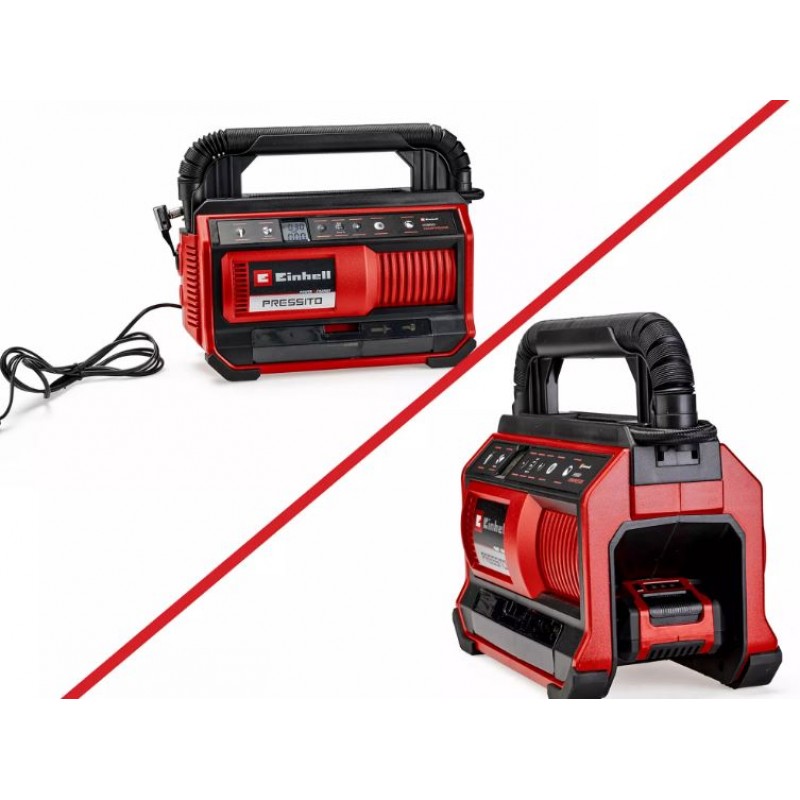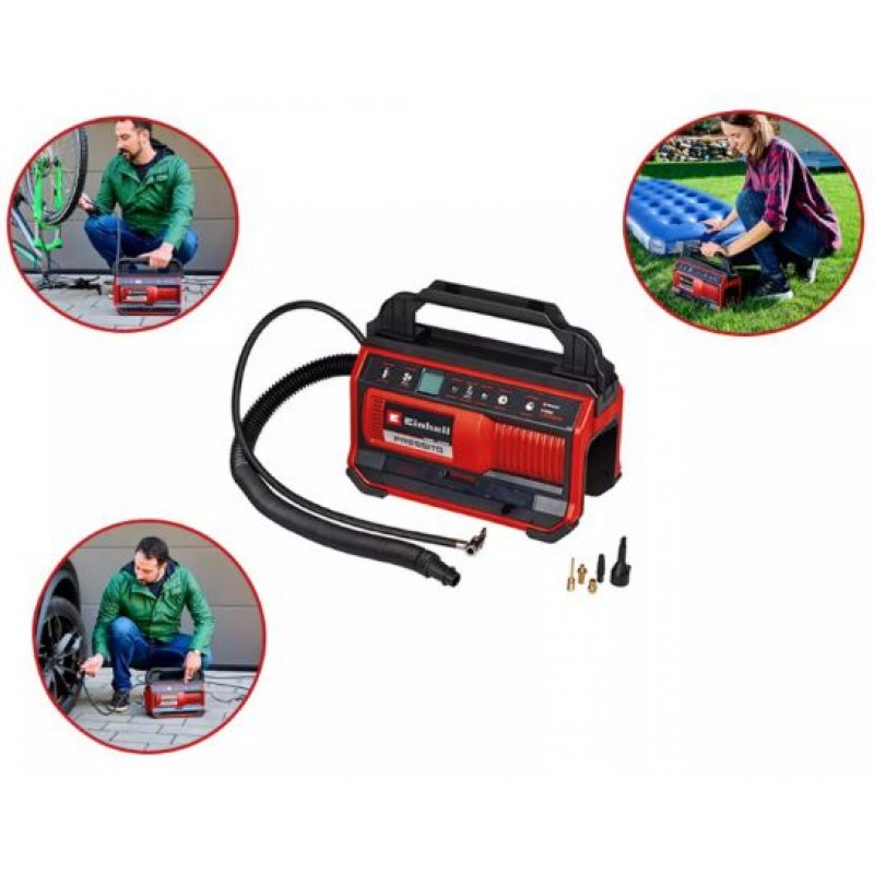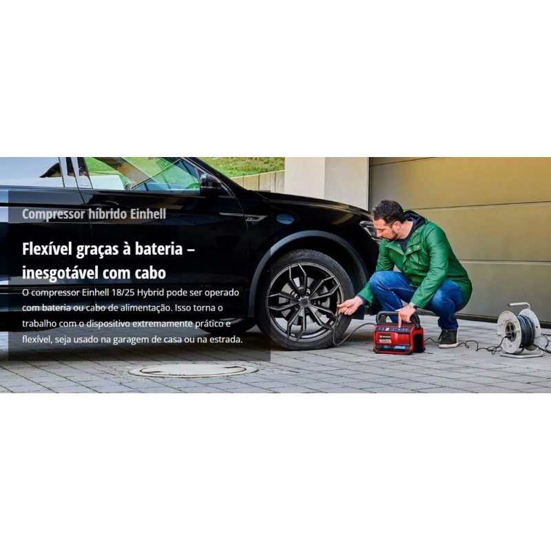 COMPRESSOR EINHELL HYBRIDO: REDE ELÉCTRICA E BATERIA (não incluída). Aspira 25 lts/min. Pressão máx: 11 Bars. Mangueira 71 cms. + Acessórios.