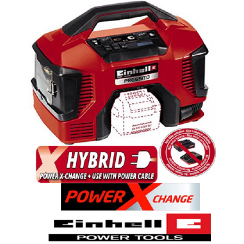 O compressor híbrido Pressito da Einhell é um compressor multifuncional com bomba de alta e baixa pressão, além da opção de sucção de baixa pressão. O prático compressor híbrido pode ser operado com um cabo de alimentação e uma potente bateria de sistema de 18 volts da série Power X-Change (função 6 em 1). O Pressito com bomba de alta pressão para encher pneus de veículos e bicicletas não é apenas um complemento perfeito para a garagem, mas também ideal para onde você estiver. O compressor também é uma ferramenta prática para esportes ao encher bolas diretamente no campo ou para a última verificação dos pneus antes de uma grande viagem de bicicleta. A pressão máxima de funcionamento da bomba de alta pressão é de 11 bar e pode ser predefinida manualmente. A função de desligamento automático para o compressor quando a pressão definida é atingida. Com a bomba de baixa pressão, colchões de ar ou barcos infláveis podem ser inflados rapidamente, e a sucção de baixa pressão suporta uma desaeração rápida. Você pode alternar da função de alta para baixa pressão pressionando um botão. A entrega inclui um conjunto de enchimento de 3 peças com adaptadores para pneus de veículos e bicicletas, para bolas de futebol e basquetebol, bem como para colchões de ar e barcos insufláveis. Os cabos e mangueiras do compressor híbrido são armazenados diretamente no aparelho para que não possam atrapalhar ou se perder. O conjunto de inflação também tem lugar fixo na caixa. O compressor híbrido está equipado com um display digital com display de pressão e a operação manual foi projetada para ser fácil de usar. O compressor híbrido compacto e leve pode ser facilmente guardado e também é adequado como companheiro móvel no carro graças ao funcionamento com bateria e à prática alça de transporte. A vantagem do funcionamento com bateria é óbvia: com a nova geração de baterias Einhell, potentes e duradouras, o compressor multifuncional também pode ser operado comodamente em movimento. As baterias com células de iões de lítio de alta qualidade também podem ser utilizadas em todos os membros da família Power X-Change, tanto no setor de jardinagem como no setor de ferramentas. As baterias e carregadores da família Power X-Change são vendidos separadamente.