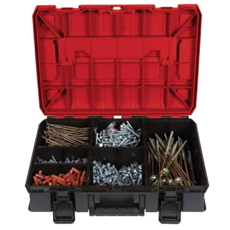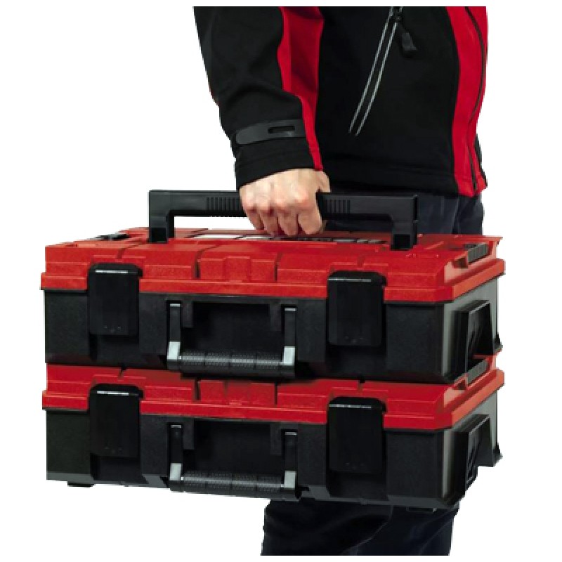 O case Einhell E-Case SF garante fácil armazenamento e transporte confortável. O case do sistema é ideal para armazenar e transportar ferramentas e acessórios. Com dimensões internas de 420,9 mm x 280,3 mm x 95,4 mm e um peso máximo de carga de 25 quilos, o case do sistema de alta qualidade oferece flexibilidade máxima e pode acomodar dispositivos variáveis, incluindo acessórios e fixações, como parafusos ou brocas. Inclui divisórias para transporte de ferramentas e acessórios. Os dois compartimentos plásticos longos, três médios e quatro curtos incluídos na entrega trazem ainda mais ordem ao sistema. Um prático sistema de travamento para conectar caixas empilhadas garante armazenamento sistemático e seguro, fácil transporte das caixas empilhadas e, graças ao design bem pensado, as caixas também podem ser abertas quando empilhadas. A caixa é feita de polipropileno e, portanto, não é apenas à prova de respingos graças ao seu design inteligente, mas também resistente ao calor e a impactos graças ao material de alta qualidade. Duas alças dobráveis ​​e ergonômicas garantem um transporte confortável. O estojo pode ser equipado com cadeados como dispositivo antirroubo. Conteúdo não incluído.
