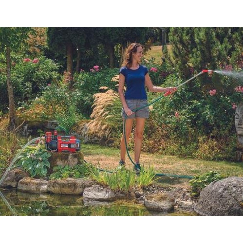 A bomba de jardim sem fio Einhell AQUINNA 18/30 F LED é uma bomba potente que pode ser usada em qualquer lugar da casa e do jardim onde a água precisa ser bombeada sem uma conexão de energia separada. O AQUINNA 18/30 F LED faz parte da flexível família Power X-Change, na qual todas as baterias, carregadores e dispositivos de sistema para ferramentas e jardinagem podem ser combinados entre si. A bomba funciona com uma bateria de 18 V. Graças à tecnologia Double Runtime e aos dois slots de bateria integrados, a bomba também pode ser equipada com duas baterias para maior autonomia. Se uma bateria estiver vazia, o fornecimento de energia muda automaticamente para a segunda bateria cheia. A capacidade das duas baterias pode ser visualizada a qualquer momento no display LED do nível de carga. A bomba de jardim está equipada com dois modos de desempenho: modo BOOST para máximo desempenho de entrega e modo ECO para máxima vida útil da bateria com menos pressão de entrega. A AQUINNA 18/30 F LED pode bombear até 3.000 litros de água por hora. Pode atingir uma altura máxima de entrega de 28 metros, o que corresponde a uma pressão máxima de entrega de 2,8 bar. A água pode ser sugada de uma profundidade de até 6 metros. Para enchimento fácil, por ex. B. durante o primeiro processo de sucção, a bomba possui um grande parafuso de enchimento de água. A bomba pode ser facilmente esvaziada, especialmente para proteção contra congelamento no inverno, utilizando o parafuso de drenagem de água na parte inferior. Para proteger contra contaminação, a bomba está equipada com um pré-filtro. Esta está rodeada por uma caixa transparente através da qual pode ver a qualquer momento se a bomba está suficientemente cheia de água e se o filtro está sujo e deve ser limpo. Uma válvula de retenção também evita que a água caia. A proteção contra sobrecarga integrada desliga automaticamente a bomba se ela superaquecer para evitar danos. A bomba de jardim sem fio está equipada com uma asa de transporte central para facilitar o transporte e orifícios de montagem para fixá-la em um local permanente. A bomba possui duas conexões roscadas metálicas robustas. A entrega não inclui bateria ou carregador; estes estão disponíveis separadamente.